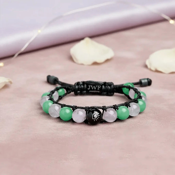 Slip in to lap of tranquility. Let that moment warm the cockle of your heart, You stand more appeased and conquered by the affluence of outpouring love from the nature. All negativity will get outdone by our rose quartz aventurine evil eye bracelet. The emblem evil eye keeps the ennui and anxiety at bay and hooks you to enjoy the refreshing moments.